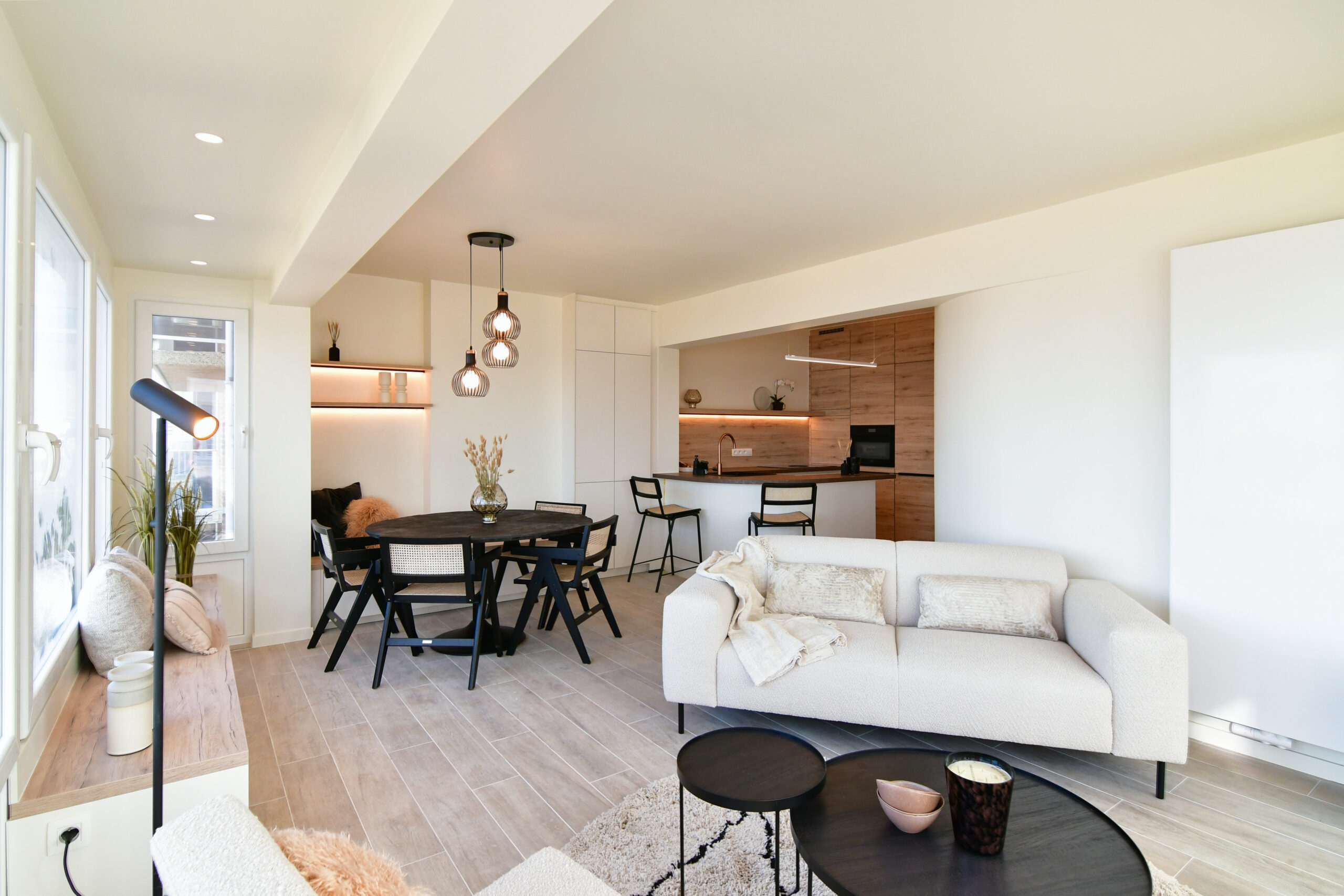Bij deze totaalrenovatie werd het volledige appartement vernieuwd. Dankzij een strakke planning en coördinatie van alle werken werd het appartement omgevormd tot een moderne en optimaal ingedeelde leefruimte. Een volledig vernieuwd interieur dat klaar is voor comfortabel en toekomstgericht wonen.